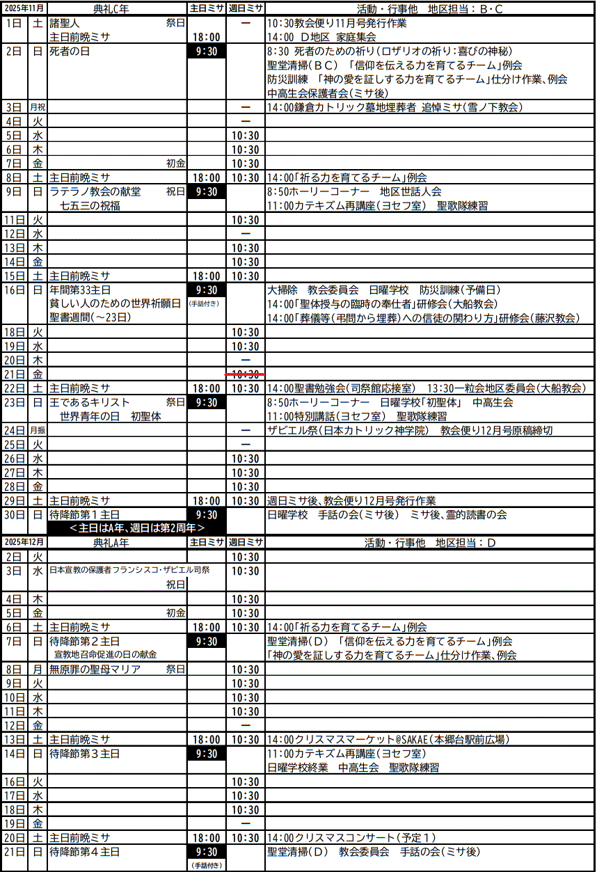 ※火〜土曜日で週日ミサがない場合は「-」で表記しています。「未定」の場合はわかり次第お伝えします。